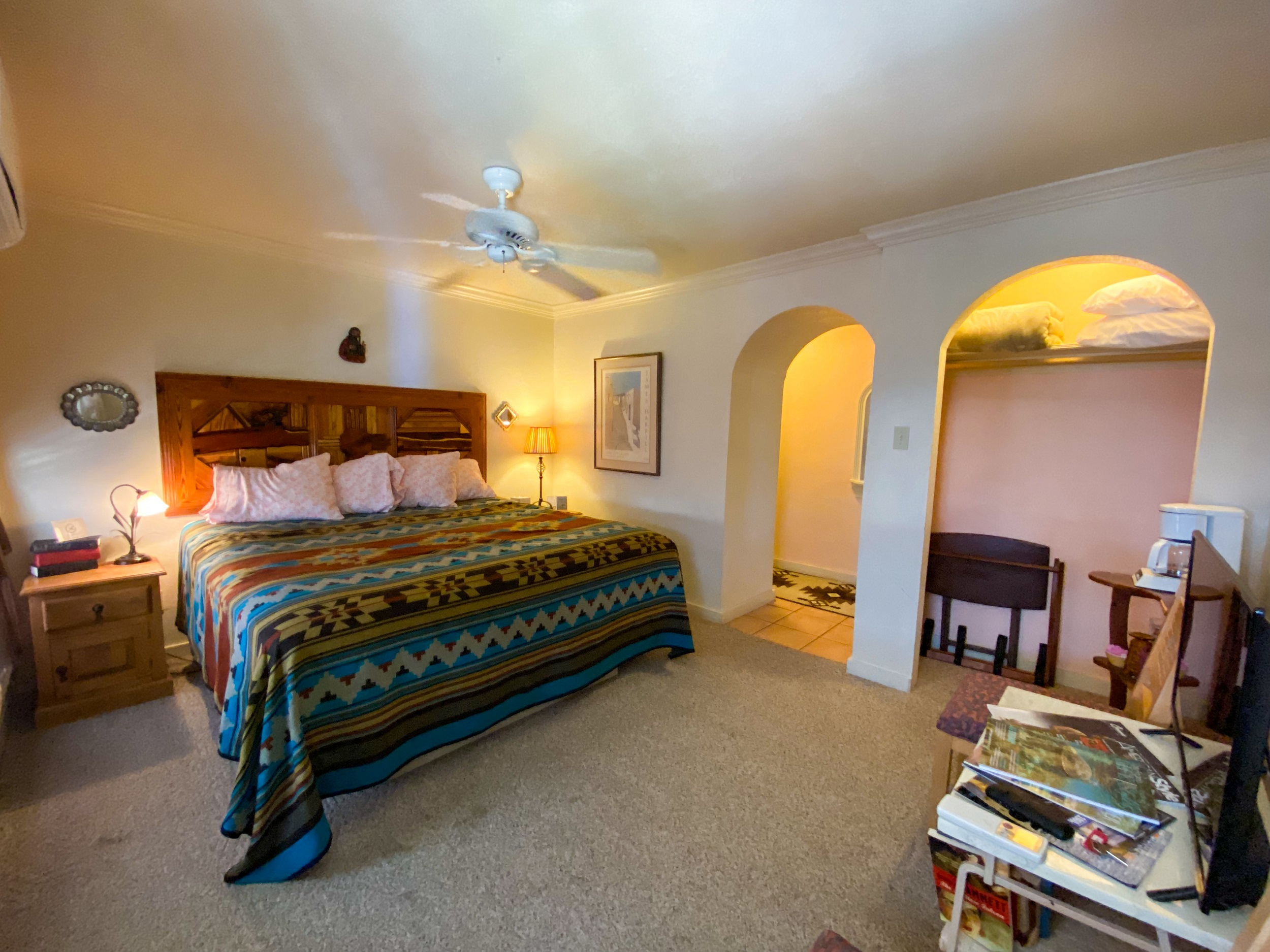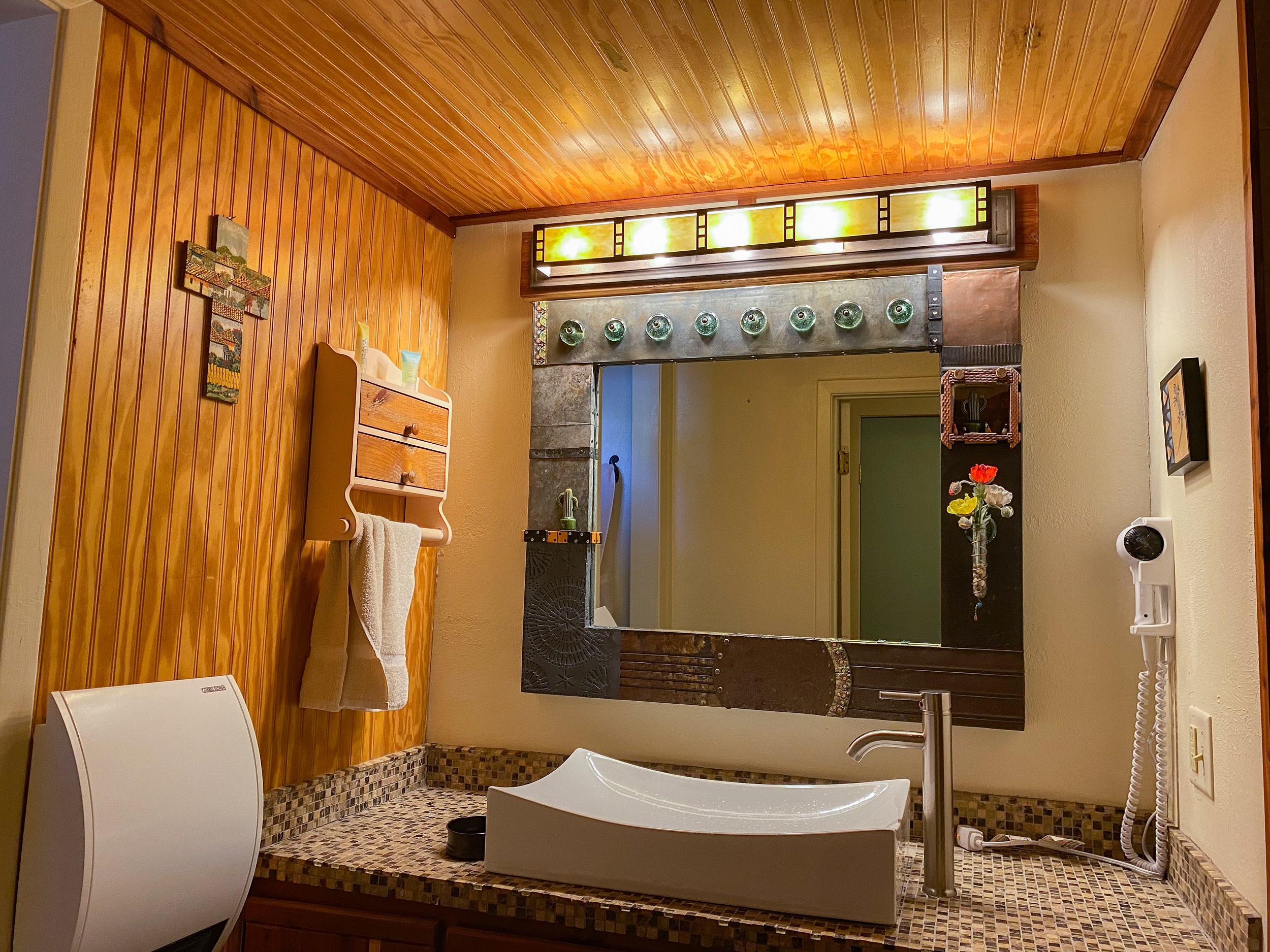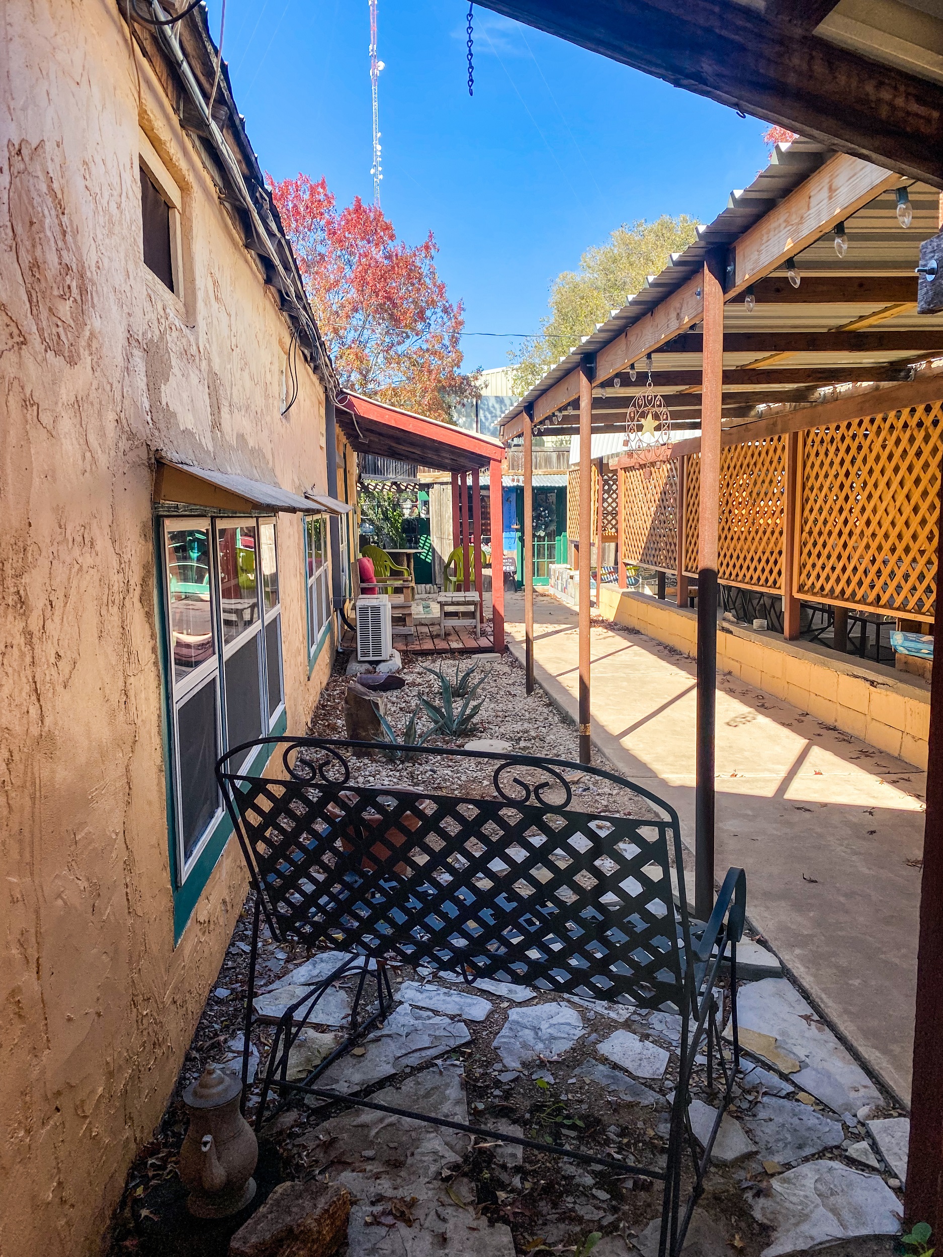 I stopped one night on the way to New Mexico in San Angelo, at the Chicken Farm Art Center. It’s a really cool “mixed-use development” (to quote directly from their website: https://www.chickenfarmartcenter.com) where artists and makers can rent space to make and/or sell their products. They also maintain a bed-and-breakfast with several single rooms or suites (I booked through Airbnb but they also have a website: https://www.innattheartcenter.com), and they have a restaurant that serves amazing food. And did I mention it was once a chicken farm? The Art Center started in the 70s when a former high school art teacher and a couple of partners bought the vacant former chicken farm and gradually turned it into a series of studios and apartments where artists could rent space to live and work.